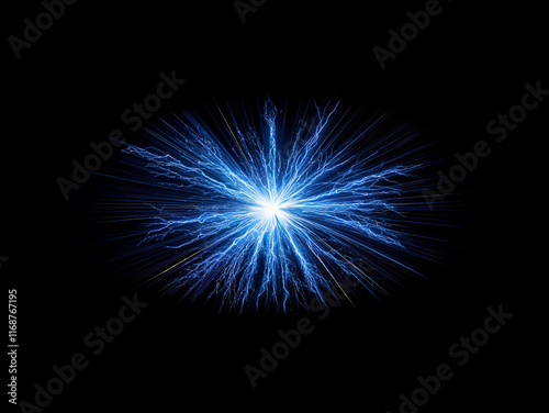 © YiuCheung, Fototapeta premium A vibrant blue energy burst explodes from a central point against a stark black background, resembling a miniature supernova or electrical discharge. The intricate, branching patterns suggest immense