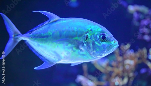 Fototapeta premium A vibrant blue fish swims in an aquarium, showcasing striking iridescent scales.