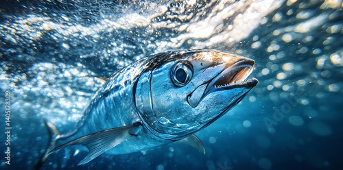 © detiyy, Fototapeta premium A vibrant blue fish swims underwater with sunlight sparkling through the water Perfect for marine life or nature documentaries