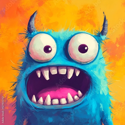 © Hassan, Fototapeta premium A vibrant blue furry monster with large eyes, sharp teeth, and tiny horns, smiling against a warm orange background.