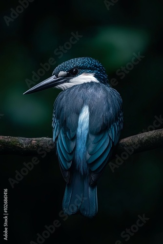 © dekreatif, Obraz premium A vibrant blue kingfisher perched on a branch, with its head turned to the side, its bright blue feathers and white markings are illuminated against a dark green background.