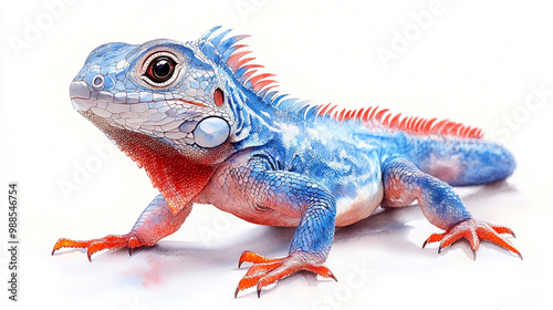 Obraz premium A vibrant blue lizard with red accents poses against a white background,...