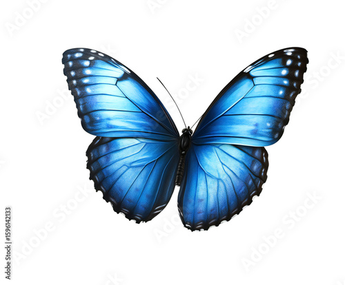 © Png World Collection, Fototapeta premium A vibrant blue morpho butterfly, isolated on transparent background, showcases its stunning wings and intricate patterns, embodying the beauty and elegance of tropical nature