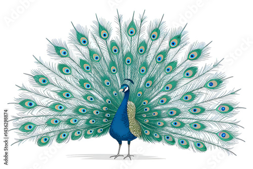 Fototapeta premium A vibrant blue peacock, a beautiful bird displaying its colorful feathers in a proud dance against a white backdrop.
