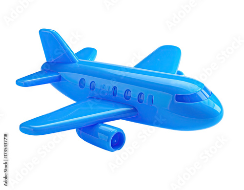 © Potato, Fototapeta premium A vibrant blue plastic toy airplane against a stark black background