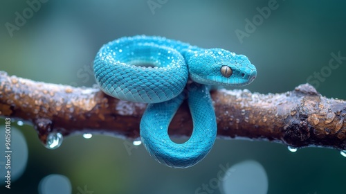 © Naru, Obraz premium A vibrant blue viper snake gracefully coiled around a branch, its scales shimmering with water droplets. The snake's bright color contrasts beautifully with the green foliage background, creating a s