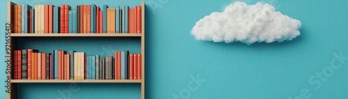 © Chanoknan, Fototapeta premium A vibrant bookshelf filled with colorful books against a teal wall and a fluffy white cloud, creating a whimsical atmosphere.