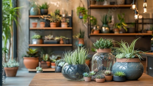 Fototapeta premium 17.A vibrant botany-themed interior showcasing air plants in glass terrariums, ceramic planters of various shapes, and small succulents on a wooden table, creating a harmonious, modern aesthetic.