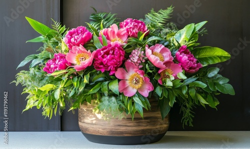 © Valentyna, Obraz premium A vibrant bouquet of bright pink peony flowers surrounded by lush greenery and foliage in a large wooden planter