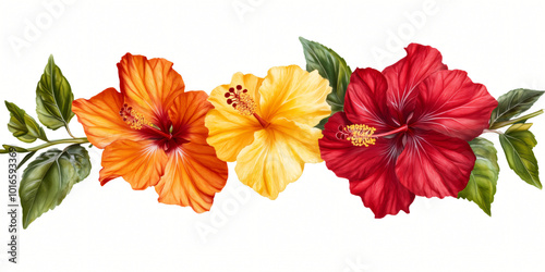 © Kobkaew, Obraz premium A vibrant bouquet of colorful flowers including hibiscus, with blossoms in shades of red, yellow, orange, and pink, captured in a close-up, isolated against a plain background