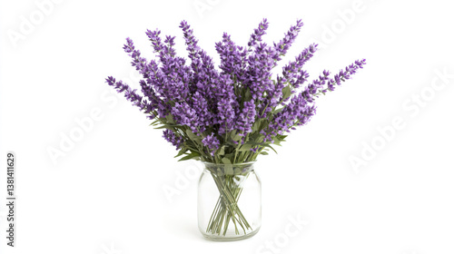 Naklejka premium A vibrant bouquet of lavender flowers in a simple glass vase, set against a stark white background