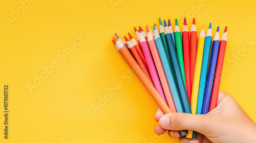 Fototapeta premium A vibrant bunch of colored pencils held against a bright yellow backdrop,...