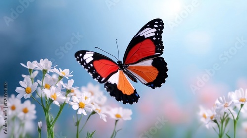 © Edo, Fototapeta premium A vibrant butterfly hovering over blooming flowers in soft light.