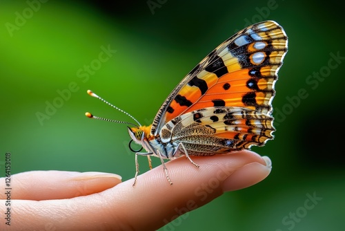 © Djokers, Obraz premium A vibrant butterfly perched delicately on a fingertip in nature.