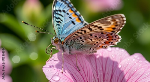 © Satya, Fototapeta premium A vibrant butterfly perched delicately on a pink flower, surrounded by a lush garden backdrop