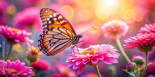 Naklejka premium A vibrant butterfly perched delicately on a pink flower, surrounded by a soft...