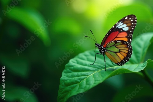 © Sumrit, Naklejka premium A Vibrant Butterfly Perched Gracefully on a Lush Green Leaf in a Tranquil Natural Setting