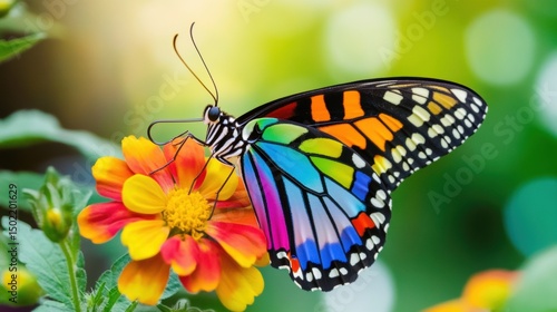 Fototapeta premium A vibrant butterfly rests gracefully on a colorful flower, showcasing its...