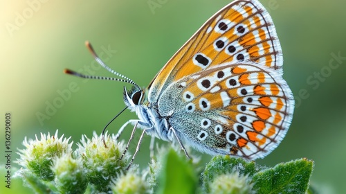 Obraz premium A vibrant butterfly rests on a green plant, showcasing intricate wing patterns