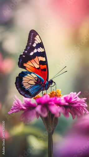 Naklejka premium A vibrant butterfly with colorful wings perched on a pink flower, surrounded...
