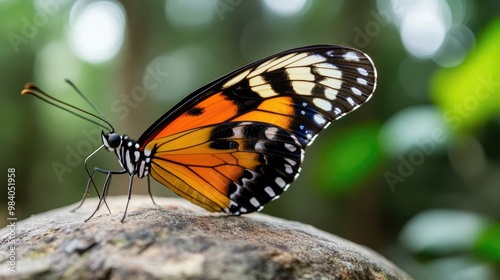 Fototapeta premium A vibrant butterfly with orange and black patterns rests on a stone,...