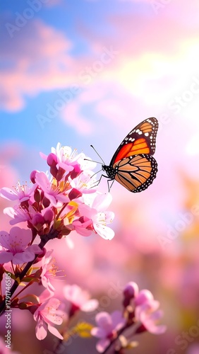 © Gan, Naklejka premium A vibrant butterfly with orange and black wings perches on pink blossoms against a soft, sunlit sky