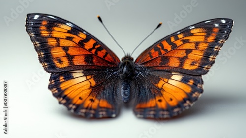 © Miramiska, Naklejka premium A vibrant butterfly with orange and black wings rests on a smooth surface. The butterfly's delicate structure is emphasized by a muted background, creating a visually striking image.