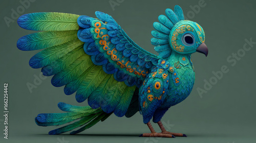 © Zohra, Obraz premium A vibrant, cartoon-like bird with green and blue plumage in 3D