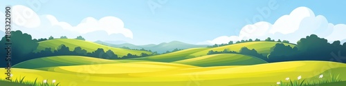 © Matthew, Obraz premium A vibrant, cartoon-style landscape with rolling hills, green fields, and a clear blue sky.