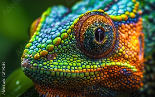 © Svitlana, Fototapeta premium A vibrant chameleon textured skin in extreme close up