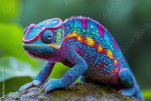 © SuperS, Obraz premium A vibrant chameleon with striking colors rests on a mossy surface, showcasing its unique patterns and textures against a lush green background.