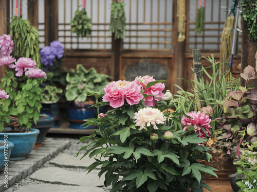 © Marut, Fototapeta premium A vibrant Chinese medicinal herb garden featuring lush peonies and various plants, creating serene and colorful atmosphere. garden showcases traditional elements and rich greenery