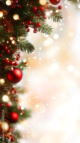 Fototapeta premium A vibrant Christmas background features a decorated tree with red ornaments...