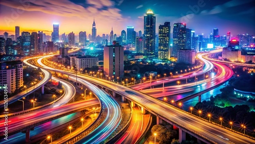 Fototapeta premium A vibrant city night scene featuring bokeh lights, showcasing blurred highway traffic movements that create a dynamic and lively atmosphere under a