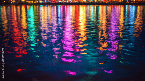 © Gilbert, Obraz premium A vibrant city river at night with neon reflections from nearby buildings shimmering across the water creating a kaleidoscopic effect.