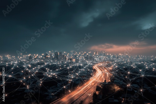 © pisan thailand, Fototapeta premium A vibrant city skyline at dusk, interconnected with glowing lines, symbolizing technology and connectivity.