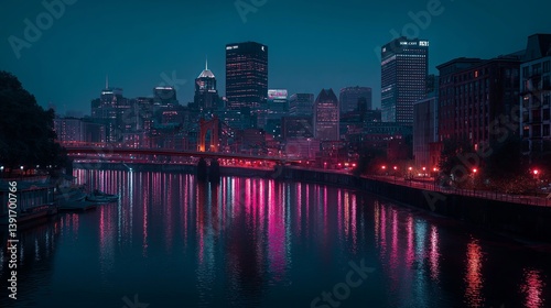 Naklejka premium A vibrant city skyline at dusk, with neon lights reflecting on a glass river