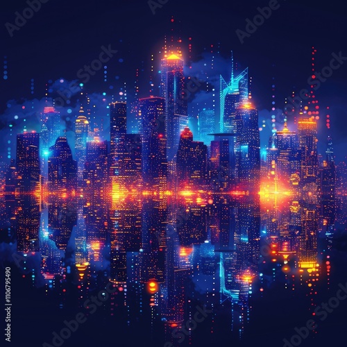 Obraz premium A vibrant city skyline at night, illuminated by colorful lights and...