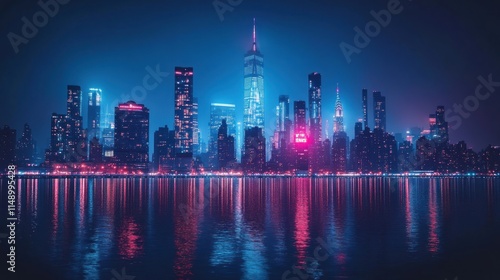 Fototapeta premium A vibrant city skyline at night, illuminated by colorful lights reflecting on...