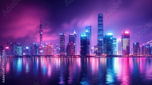 Fototapeta premium A vibrant city skyline at night, lights reflecting in the water