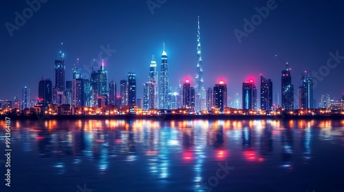 © ratcha, Fototapeta premium A vibrant city skyline at night, showcasing modern architecture and reflections on water.