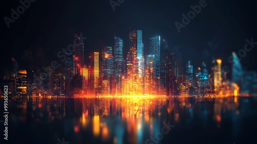 © Helois, Fototapeta premium A vibrant city skyline at night with glowing lights reflected in the water.