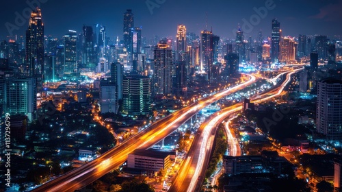 © gentho, Fototapeta premium A vibrant city skyline at night with illuminated buildings and flowing traffic.