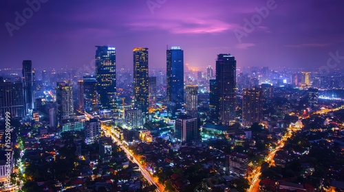 © Soem, Obraz premium A vibrant city skyline at night with tall buildings illuminated by neon lights, a mix of urban and natural elements, and a dramatic sky with a gradient of purple and orange hues.