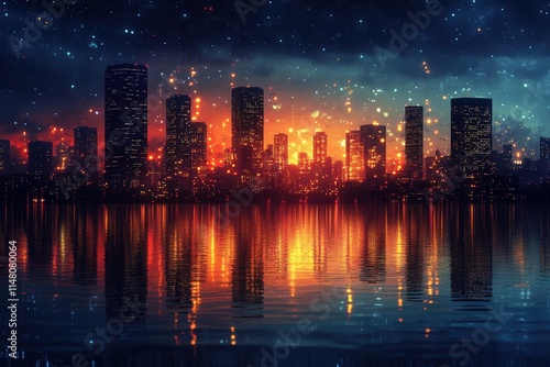 Fototapeta premium A vibrant city skyline at sunset, reflecting colors on the water's surface.
