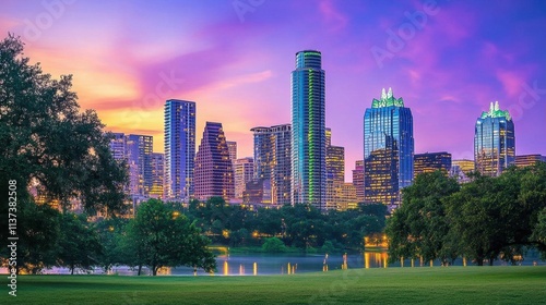 © Graphiq, Fototapeta premium A vibrant city skyline at sunset, reflecting on a serene lake.