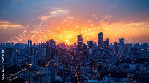 Obraz premium A vibrant city skyline at sunset, showcasing connectivity and modern...