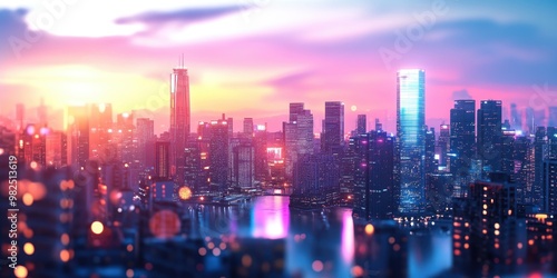 Obraz premium A vibrant city skyline at sunset, showcasing towering skyscrapers, warm...