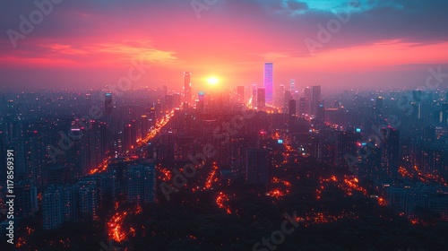 © aritha, Fototapeta premium A vibrant city skyline at sunset, showcasing urban life and architecture in stunning colors.