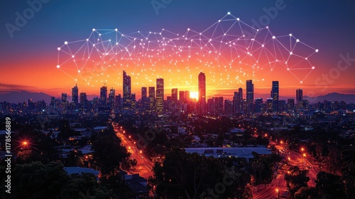 © aritha, Fototapeta premium A vibrant city skyline at sunset with a digital network overlay.